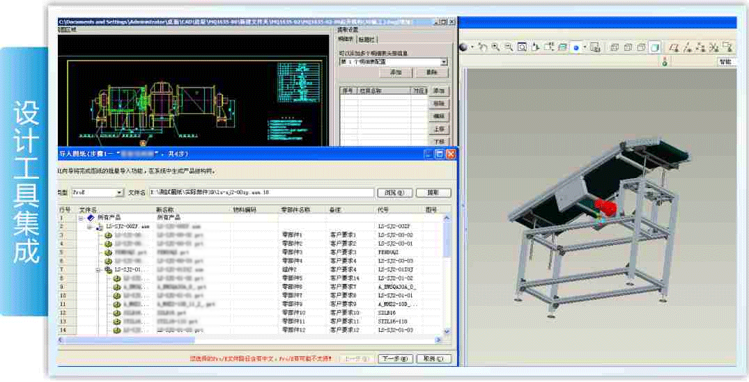 ●對整套已完成的產品Autocad或ProE圖紙進行產品結構分析,直接生成多層產品明細表(產品BOM),并保證圖紙修改后,對應零部件的信息自動同步更新。