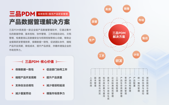 隨著合作的深入,雙方實(shí)現(xiàn)了PDM與企業(yè)ERP系統(tǒng)的全面集成。這一突破意味著研發(fā)與生產(chǎn)、供應(yīng)鏈等環(huán)節(jié)的數(shù)據(jù)壁壘被打破,實(shí)現(xiàn)了真正意義上的數(shù)據(jù)貫通。通過(guò)API接口實(shí)現(xiàn)的三品PDM與ERP系統(tǒng)無(wú)縫對(duì)接,使物料、BOM及工藝數(shù)據(jù)能夠自動(dòng)同步,支撐生產(chǎn)計(jì)劃精準(zhǔn)執(zhí)行,顯著縮短產(chǎn)品交付周期。