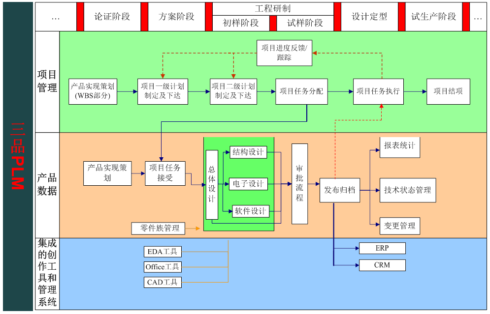 PLM根據CIMDATA的定義,PLM是一種應用于在單一地點的企業內部、分散在多個地點的企業內部,以及在產品研發領域具有協作關系的企業之間的,支持產品全生命周期的信息的創建、管理、分發和應用的一系列應用解決方案,它能夠集成與產品相關的人力資源、流程、應用系統和信息。PLM是對產品從創建到使用,到報廢等全生命周期的產品數據信息進行管理的一整套解決方案。不僅針對研發過程中的產品數據進行管理,同時也包括產品數據在生產、營銷、采購、服務、維修等部門的應用。