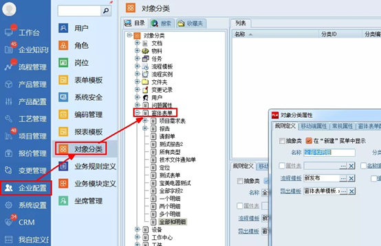 選擇“企業配置”-->“對象分類”,在右邊對象分類樹的“窗體表單”節點下,找到需要設置的窗體表單名,點擊鼠標右鍵,彈出右鍵菜單,點擊“屬性”。