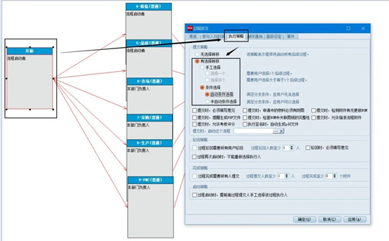 首先在【開始】的節(jié)點進行設置,在【執(zhí)行策略】界面,選擇【有選擇轉移】-【條件轉移】-【自動條件選擇】。此時流程可根據(jù)設置的條件進行自動的轉移。