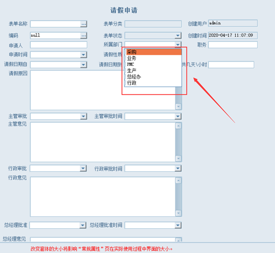 若請假表單如下圖,在用戶填寫好請假申請單后,發(fā)起申請流程,流程轉移條件可根據(jù)用戶所屬部門進行條件轉移。