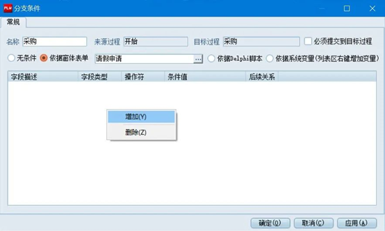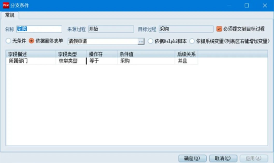 在出現(xiàn)的條件值上,《字段描述》選擇“所屬部門”,《條件值》選擇“采購”,勾選【必須提交到目標過程】,然后確定即可。此時條件設置完成,當用戶在《請假申請》單中所屬部門選擇“采購”時,啟動流程后自動提交到采購部進行審核。其他部門設置同樣如上。
