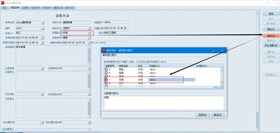 如果請假的窗體表單已經(jīng)和該流程綁定,在沒有設置流程轉移條件的情況中,用戶填寫好請假表單后,發(fā)起該流程時,就需要用戶手動選擇對應的流程節(jié)點,如下圖: