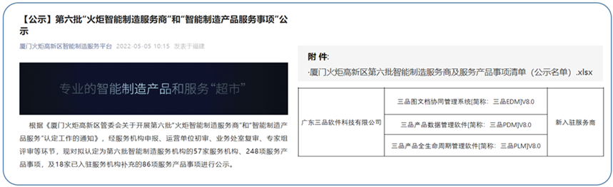 近日,第六批“火炬智能制造服務(wù)商”和“智能制造產(chǎn)品服務(wù)事項”正式在廈門火炬高新區(qū)智能智造服務(wù)平臺網(wǎng)站公示結(jié)果,三品軟件的“三品圖文檔協(xié)同管理系統(tǒng)[簡稱:三品EDM]V8.0、三品產(chǎn)品數(shù)據(jù)管理軟件[簡稱:三品PLM]V8.0、三品產(chǎn)品全生命周期管理軟件[簡稱:三品PLM]V8.0”三大產(chǎn)品成功入選,有幸成為廈門火炬高新區(qū)智能智造服務(wù)商資源池產(chǎn)品。
