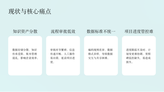 流程審批效率低下:從設(shè)計評審、圖紙發(fā)放到變更執(zhí)行,多數(shù)環(huán)節(jié)仍依靠紙質(zhì)單據(jù)與線下溝通,流程周期長、節(jié)點不透明、追溯困難。尤其在多部門協(xié)同項目中,信息傳遞延遲與誤差直接影響項目進(jìn)度與交付質(zhì)量。