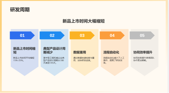 1.研發(fā)周期顯著縮短:通過數(shù)據(jù)快速檢索與重用、流程自動(dòng)化及協(xié)同效率提升,新品上市時(shí)間平均縮短15%-25%。某中型工程機(jī)械企業(yè)報(bào)告稱,其典型產(chǎn)品的詳細(xì)設(shè)計(jì)周期從原來的平均180天減少至145天。
