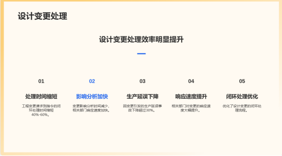 2.設(shè)計(jì)變更處理效率提升:工程變更請(qǐng)求(ECR)到工程變更指令(ECO)的閉環(huán)處理時(shí)間平均縮短40%-60%。變更影響分析時(shí)間減少,相關(guān)部門的響應(yīng)速度加快,因變更引發(fā)的生產(chǎn)延誤事故下降超過30%。
