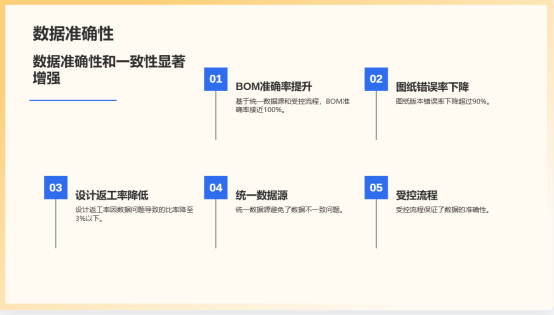 3.數(shù)據(jù)準(zhǔn)確性與一致性增強(qiáng):基于統(tǒng)一數(shù)據(jù)源和受控流程,BOM準(zhǔn)確率接近100%,圖紙版本錯(cuò)誤率下降超過90%。設(shè)計(jì)返工率因數(shù)據(jù)問題導(dǎo)致的比率從平均12%降至3%以下。