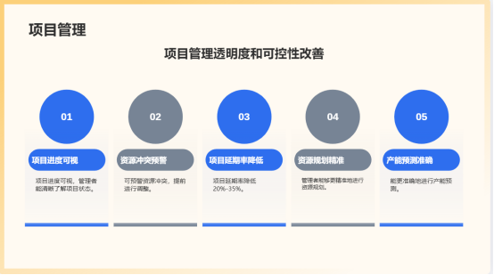 5.項(xiàng)目管理透明度與可控性改善:項(xiàng)目進(jìn)度可視,資源沖突可預(yù)警,使得項(xiàng)目延期率降低20%-35%。管理者能夠更精準(zhǔn)地進(jìn)行資源規(guī)劃和產(chǎn)能預(yù)測。