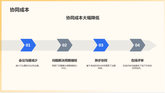6.協(xié)同成本降低:減少不必要的會(huì)議和溝通,基于系統(tǒng)的異步協(xié)同和在線評(píng)審使得跨部門問題解決周期縮短約50%。