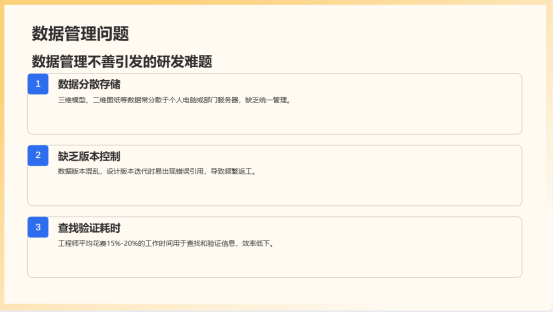 1.數(shù)據(jù)管理碎片化與版本混亂:研發(fā)過程產(chǎn)生大量三維模型、二維圖紙、技術(shù)文檔、仿真數(shù)據(jù)及BOM物料清單。這些數(shù)據(jù)常分散于個(gè)人計(jì)算機(jī)或部門服務(wù)器,缺乏統(tǒng)一、安全、版本受控的中央庫管理。設(shè)計(jì)版本迭代時(shí)易出現(xiàn)錯(cuò)誤引用,導(dǎo)致返工。據(jù)行業(yè)數(shù)據(jù),工程師平均花費(fèi)15%-20%的工作時(shí)間用于查找和驗(yàn)證信息。