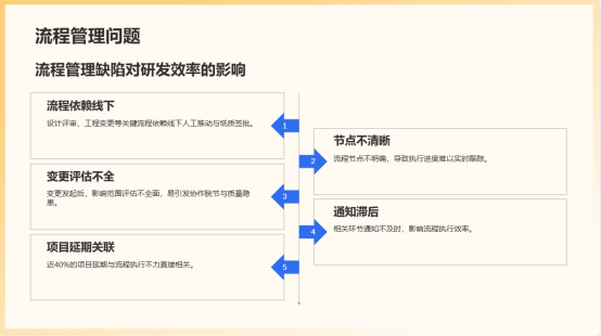 2.流程非標(biāo)準(zhǔn)化與執(zhí)行不透明:設(shè)計(jì)評(píng)審、工程變更、項(xiàng)目審批等關(guān)鍵流程依賴線下人工推動(dòng)與紙質(zhì)簽批,流程節(jié)點(diǎn)不清晰,執(zhí)行進(jìn)度難以實(shí)時(shí)跟蹤。變更發(fā)起后,影響范圍評(píng)估不全,相關(guān)環(huán)節(jié)通知滯后,易引發(fā)協(xié)作脫節(jié)與質(zhì)量隱患。調(diào)研指出,近40%的項(xiàng)目延期與流程執(zhí)行不力直接相關(guān)。