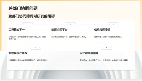 3.跨部門協(xié)同壁壘高:機(jī)械設(shè)計(jì)、電氣控制、工藝工裝、采購生產(chǎn)等環(huán)節(jié)往往使用不同工具,數(shù)據(jù)格式不一,且缺乏有效的協(xié)同平臺(tái)。信息傳遞異步、滯后,問題反饋周期長。特別是在復(fù)雜機(jī)電一體化設(shè)備開發(fā)中,跨領(lǐng)域設(shè)計(jì)沖突常在后期才暴露,造成大規(guī)模設(shè)計(jì)修改。