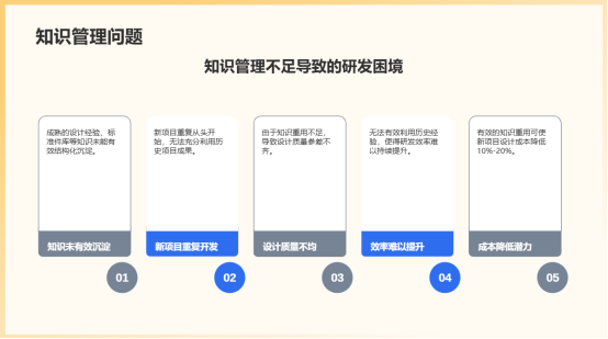 4.知識(shí)資產(chǎn)沉淀與重用不足:成熟的設(shè)計(jì)經(jīng)驗(yàn)、標(biāo)準(zhǔn)件庫、通用模塊、故障解決方案等知識(shí)未能有效結(jié)構(gòu)化沉淀。新項(xiàng)目重復(fù)從頭開始,無法充分利用歷史項(xiàng)目成果,導(dǎo)致設(shè)計(jì)質(zhì)量不均且效率難以持續(xù)提升。行業(yè)分析表明,有效的知識(shí)重用可使新項(xiàng)目設(shè)計(jì)成本降低10%-20%。