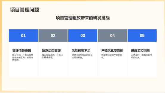 5.項(xiàng)目管理與資源調(diào)配粗放:項(xiàng)目計(jì)劃、任務(wù)分派、進(jìn)度監(jiān)控、資源負(fù)荷管理多依賴表格工具,難以實(shí)現(xiàn)動(dòng)態(tài)、可視化的精細(xì)管理。資源沖突與項(xiàng)目風(fēng)險(xiǎn)無法提前預(yù)警,影響整體研發(fā)產(chǎn)能的優(yōu)化。